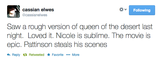 Cassian Elwes tweeted that he saw a rough version of Queen of the Desert and had fantastic things to say. Take a look below!